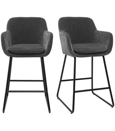 Avec leur silhouette élancée et leur design soigné, les tabourets de bar AMIKA dévoilent une modernité élégante et universelle. On aime particulièrement le contraste entre le piètement luge en métal noir très élancé et l' enveloppante assise rembourrée et moelleuse à souhait. L'assise et le dossier sont entièrement recouverts d'un joli tissu effet velours 100 % polyester à l'aspect et au toucher doux. La teinte gris foncé ajoute à l'ensemble une touche tendance élégante. AMIKA, c'est tout le confort d'un fauteuil... en version tabouret de bar. La généreuse assise (densité 24 kg/m3), la belle hauteur du dossier (H33.5 cm) ainsi que le repose-pied intégré vous permettront de profiter de moments conviviaux confortablement installés. Avec leurs accoudoirs englobants, les chaises hautes AMIKA rappellent l'esprit cocooning des fauteuils de salon. On adore ! Avec leur hauteur d'assise de 65 cm , ces tabourets hauts habilleront un îlot de cuisine ou une table haute de 90 cm environ. Vendus ...