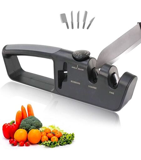 AIGUISEUR - Cet aiguiseur de couteaux et ciseaux est un indispensable pour votre cuisine. Il permet d'aiguiser tous vos couteaux, qu'ils soient en acier ou en céramique, et vos ciseaux à la perfection. Il a été conçu avec 4 fentes d'aiguisage : 3 fentes contiennent 3 matériaux spécifiques pour prendre soin de vos lames de couteau et 1 fente pour l'aiguisage des ciseaux. 3 ÉTAPES - Les 3 premières fentes correspondent à 3 étapes d'aiguisage des couteaux : la première fente diamantée prépare la lame en corrigeant les bords endommagés avant l'affûtage. La deuxième fente en carbure de tungstène aiguise la lame. La dernière fente en céramique polit la lame pour une finition optimale. Ces 2 dernières étapes ne conviennent pas aux lames céramiques ! Cela pourrait les briser dans le pire des cas. SÉCURITÉ - La manipulation et l'aiguisage de couteaux peut être dangereux, c'est pour cela que l'aiguiseur """"samouraï"""" a été désigné avec une garde entre votre main et les fentes d'aiguisage ...