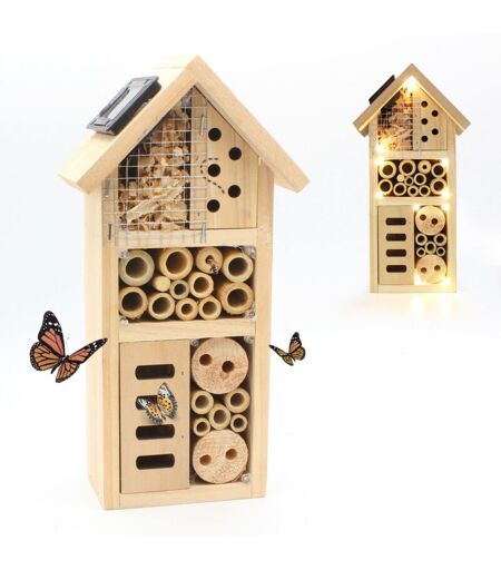HÔTEL À INSECTE - Cette structure verticale est un hôtel à insecte à placer dans votre extérieur. Celui-ci permet à la faune de s'installer librement dans l'une des 5 chambres proposées. En bois de pin massif, cet hôtel est autonome en énergie et peut accueillir de nombreuses espèces d'insectes, qui feront leur vie dès l'installation. IP44, il est résistant aux intempéries et peut demeurer en extérieur en toutes saisons. PANNEAU SOLAIRE - L'hôtel dispose d'un panneau solaire sur la toiture relié à une batterie qui alimente 10 LED. Ce panneau capte l'énergie solaire durant la journée et fait fonctionner les LED pendant environ 8h à la nuit tombée (selon l'exposition au soleil). La lumière, en plus d'apporter un agréable aspect décoratif à votre extérieur, attirera les insectes qui profiteront d'un bain de soleil nocturne, à l'hôtel, comme s'ils étaient en vacances. PANNEAU SOLAIRE - L'hôtel dispose d'un panneau solaire sur la toiture relié à une batterie qui alimente 10 LED. Ce panneau ...