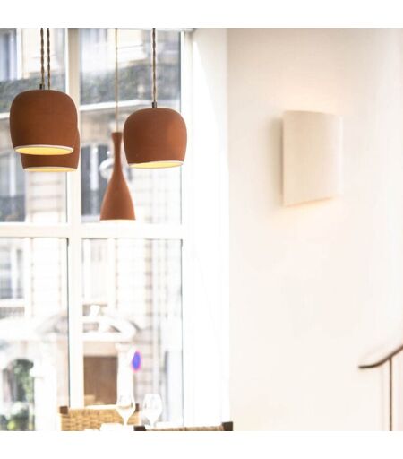 Description générale Le lustre en céramique terracotta Marcel est une pièce unique qui apporte une touche de fraîcheur à votre décoration contemporaine. Avec son design minimaliste et sa couleur chaude, il est parfait pour éclairer de petits espaces sans les alourdir. Sa forme arrondie et végétale s'intègre harmonieusement dans divers styles d'intérieur, que ce soit une ambiance minimaliste ou inspirée des médinas. Spécifications techniques Hauteur de l'abat-jour : 14 cm Diamètre : 16 cm Couleur : terracotta mate à l'extérieur / blanc mat à l'intérieur Rosace plafond en métal blanc de 12 cm de diamètre Câble textile en jute de 200 cm Nécessite 1 ampoule E27 de 6W max. (non fournie) Garantie de 2 ans par le fabricant français Compatibilité et accessoires Compatible avec les ampoules E27 LED (à découvrir dans le catalogue Millumine) Installation Le lustre se fixe facilement au plafond grâce à sa rosace en métal. Assurez-vous d'utiliser des ampoules adaptées pour un éclairage optimal. ...