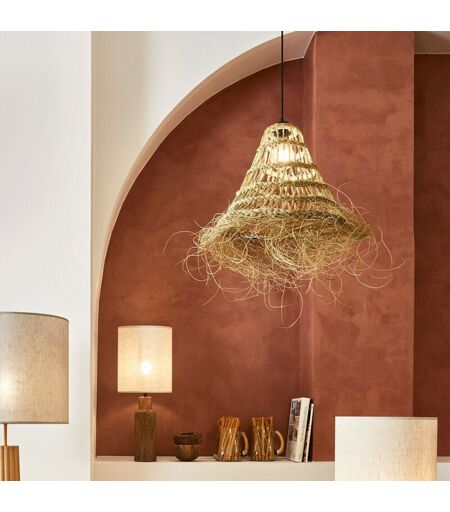 Suspension moderne en fibres végétales (Alfa) de forme conique à maillage ajouré fabriquée au Maroc. C'est le luminaire ethnique qu'il vous faut dans une ambiance méditerranéenne. Nécessite 1 ampoule E27 de 15W max. Livrée avec boîtier Isodome et câble électrique noir. Voici le lustre suspension idéal pour créer dans votre intérieur, une ambiance moderne Japandi. On aime l'utilisation de fibres végétales (Alfa du désert) qui donnent à lustre naturel, un petit côté 'fait-main' qui correspond parfaitement à la tendance actuelle du slow living. Alors pour votre déco bien-être, choisissez ce luminaire brut de fabrication Marocaine ! Caractéristiques techniques de votre lustre suspension en fibres végétales : - Hauteur totale : 116 cm - Hauteur abat-jour : 36 cm - Diamètre abat-jour : 40 cm - Pavillon plafond : 7.5 cm (diamètre) / 6.5 cm (hauteur) Lustre conique en mailles de fibres végétales ajourés (Alfa) fabriqué à la main au Maroc avec cordon électrique en pvc de 102 cm de longueur. ...