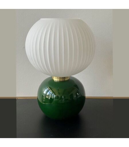 Adorable lampe de chevet en verre avec pied rond en verre teinté vert dans la masse, surmontée d'un abat-jour globe également en verre blanchi et strié. On adore cette charmante lampe de table et on craque pour sa belle couleur émeraude ! Avec sa bague couleur laiton, voici un luminaire pour table de nuit qui s'adapte à toutes les ambiances déco avec cependant un faible pour le style rétro-chic qui lui va si bien. Nécessite 1 ampoule E27 non incluse. Parfaite en toute sobriété sur une table de nuit comme pour éclairer une entrée plus contemporaine, voici une lampe verte qui brille par son allure design comme par son matériau 100% verre, rehaussé d'une délicate bague dorée. Cette petite lampe en verre trouvera facilement sa place dans la belle sobriété de votre salon où sa couleur vert profond apportera une touche colorée idéale dans les ambiances aux tons chauds et naturels. Caractéristiques techniques de la lampe Adonis vert : Hauteur totale : 28 cm Diamètre de la verrine : 20 cm ...