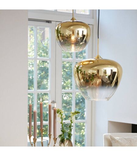 Superbe suspension en verre avec sa teinte or en dégradé ! Magnifique en éclairage de cuisine comme en lustre de salon, ce luminaire s'installe seul façon 'soliflor' pour mettre en valeur un point précis ou 'en bouquet décalé' pour jouer avec l'architecture. Adepte des ambiances épurées et des pièces originales, ne passez pas à côté de ce délicat lustre d'ambiance qui vous charmera par son ton doré en dégradé jusqu'à finir par le verre transparent ainsi que sa forme en goutte. Pour une ambiance shiny chic, en ligne au dessus de votre cuisine ou par paire pour mettre en valeur votre espace de vie, la suspension Mayson brillera par son originalité ! Caractéristiques techniques de la suspension en verre Mayson: Hauteur (hors fil) : 25 cm et hauteur totale avec fil en textile noir : 155 cm Diamètre : 30 cm Suspension design constituée d'un abat-jour en verre teinté or en dégradé, monté sur un câble électrique en textile noir et socle plafond doré. Ampoule E27 de 40W max. non incluse. ...