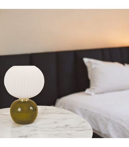 Envie d'une lampe de chevet en verre avec pied rond en verre teinté kaki dans la masse, surmontée d'un abat-jour globe également en verre blanchi et strié, cette charmante lampe de table est faite pour vous ! Avec sa bague couleur laiton, voici un luminaire pour table de nuit qui s'adapte à toutes les ambiances déco avec cependant un faible pour le style rétro-chic qui lui va si bien. Nécessite 1 ampoule E27 non incluse. Parfaite en toute sobriété sur une table de nuit comme pour éclairer un salon, voici une lampe kaki et blanche qui brille par son allure design comme par son matériau 100% verre, rehaussé d'une délicate bague dorée. Cette lampe en verre trouvera facilement sa place dans la belle sobriété de votre salon, de votre chambre où sa couleur kaki apportera une touche colorée idéale dans les ambiances aux tons chauds et naturels. Caractéristiques techniques de la lampe Adonis kaki : Hauteur totale : 28 cm Diamètre de la verrine : 20 cm Hauteur de la verrine : 16 cm Diamètre du ...