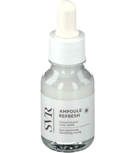 Ce sérum matinal ultra-frais va réveiller, tonifier et lisser le contour des yeux.Sa formule, enrichie en caféine, stimule le regard, favorise la micro-circulation et décongestionne pour agir sur les cernes et les poches. Enrichie en peptides et acide hyaluronique, le contour des yeux est lissé, raffermi et hydraté, prêt pour affronter la journée. Son vrai plus, son packaging innovant ! Sa pipette massante métallique permet de délivrer le produit sur la zone souhaitée et de masser avec un effet frais immédiat pour maximiser l’efficacité anti-poches, anti-cernes.Fini les yeux bouffis et cernés au réveil, le regard est frais, réveillé et lissé. La zone du regard est la première touchée par les signes de l’âge : cernes, poches, ridules puis rides… Cinq fois plus fine que le reste du visage, et sursollicitée au quotidien, il est essentiel de traiter cette zone de manière spécifique. Saviez-vous que votre peau possède sa propre horloge biologique appelée cycle circadien ? Adapter sa routine contour des yeux aux besoins de la peau au fil de la journée pour plus d’efficacité, c’est la promesse de REFRESH : tonifier et lisser le regard, hydrater pour favoriser la protection quotidienne.AMPOULE REFRESH a été imaginée et développée comme une véritable expérience. Sa formule sérum ultra fraîche concentrée en actifs associée à son packaging innovant massant agit directement sur les cernes, les poches, les rides et ridules. Formulée avec 90% d’ingrédients d’origine naturelle, sa formule experte et technique puise sa force grâce à : 2% Caféine végétale: Défatigue et tonifie le regard, les cernes sont nettement réduites.2% Peptides : Lissent la peau, détendent les traits. Acide Hyaluronique : De moyen poids moléculaire il hydrate le contour de l’œil, les rides et ridules sont visiblement lissées. INNOVATION Packaging : Pipette avec embout massant métallique. L’effet glaçon immédiat et les massages permettent de maximiser l’efficacité décongestionnante. Testé sous contrôle dermatologique et ophtalmologique. Convient aux porteurs de lentilles.BénéficesEFFICACITÉ PROUVÉE SUR LE CONTOUR DES YEUX SENSIBLES : -27% de visibilité des cernes(1)-31% des poches(1)-24% des rides et des ridules(2)+40% de fermeté sur la zone contour des yeux(2)Hydratation 8H(3)(1) Score dermatologique sur 31 sujets après 56 jours d'application 1 fois par jour, % de variation. (2) Auto-évaluation sur 31 sujets après 56 jours d'application 1 fois par jour, % de variation.IndicationsPour tous les contours des yeux sensibles, dès les premiers signes de l’âge. Convient aux porteurs de lentillesConseils d'utilisationPrélever une petite quantité de sérum avec la pipette, appliquer sur le contour de l’œil non irrité, puis masser avec l’embout métallique. Vous pouvez terminer le geste avec le bout des doigts pour finir de faire pénétrer le soin. Ne pas appliquer dans l’œil.Pour maximiser l’efficacité de l’ampoule, n’hésitez pas à appliquer les gestes d’automassages. CompositionAQUA/WATER/EAU,... ...