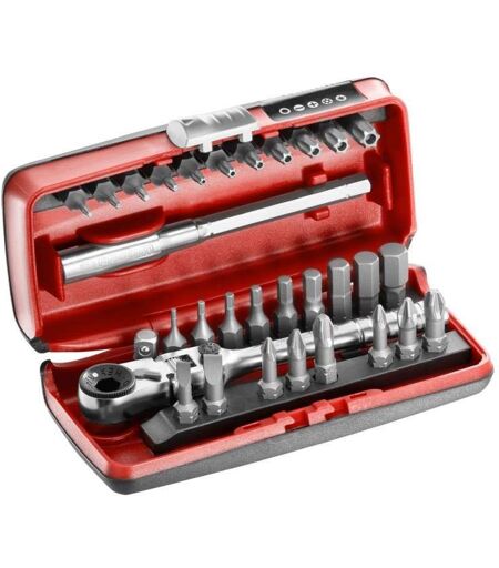 Coffret d'embouts de vissage 1/4'' avec clé à cliquet FACOM R.180J31PB (31 pièces) Contient : 1 Cliquet porte-embouts 1/4" ultra-compact tête flexible : R.180 1 Rallonge : L 100 mm (EF.R180) 28 Embouts - entraînement 1/4" - 6,35 mm - L 25 mm : EP.1T pour vis cruciformes Phillips® : PH1 - PH2 - PH3 ED.1T pour vis cruciformes Pozidriv® : PZ1 - PZ2 - PZ3 ES.1T pour vis à fente : 4 - 5,5 mm EH.1 pour vis 6 pans creux métriques : 1,5 - 2 - 2,5 - 3 - 4 - 5 - 6 - 7 - 8 mm EX.1 pour vis Torx® : T6 - T7 - T8 - T9 EXR.1 pour vis Resistorx® : TT10 - TT15 - TT20 - TT25 - TT27 - TT30 - TT40 1 Eembout porte-douilles : ECR.1 Coffret bimatière vide : BV.RPE1 H [mm] 65 L [mm] 205 P [mm] 160 [kg] 0.335 ...