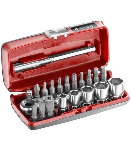 Coffret de serrage et vissage FACOM R1PICOPB 1/4'' + Clé à cliquet 1 clé à cliquet ultra compacte 1 rallonge : 100 mm 1 porte-embouts 5 douilles 6 pans métriques : 6 - 8 - 10 - 12 - 13 mm 3 embouts plats : 4,5 - 6,5 - 8 mm 2 embouts Phillips : PH1 - PH2 1 embout Pozidriv : PZ2 4 embouts hexagonaux : 3 - 4 - 5 - 6 mm 7 embouts Resistorx® : TT10 - TT15 - TT20 - TT25 - TT30 ...