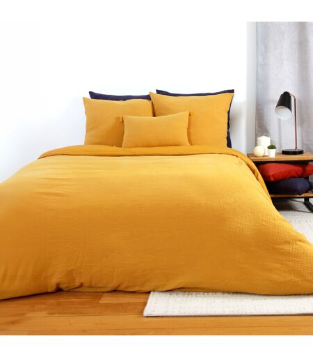 Parure de lit 240x220 cm double gaze de coton GAZGAZ jaune moutarde 3 pièces Améliorez la qualité de votre sommeil avec la parure de lit Gazgaz. Avec un côté 100% coton et un autre en double gaze de coton, elle vous apportera une douceur inégalée avec un effet gauffré et une grande facilité d'entretien. Le gaze de coton correspond à une superposition de deux tissus fins obtenus par un tissage de fils entrecroisés et assemblés par des points invisibles à intervalles réguliers. Vous aurez le choix entre plusieurs couleurs automnales pour une ambiance cocooning garantie ! Côté technique : recto double gaze de coton 140g/cm2 et verso 100% coton 57 fils/cm2 Couleurs garanties grand teint 1 housse de couette avec finition sans rabat, fermeture boutons et passe-mains 2 taies d'oreiller carrées 63x63 cm forme sac avec rabat Fabriqué au Bangladesh Les plus du produit : Le gaze de coton encore plus doux que le coton ! Linge de lit certifié Standard 100 OEKO-TEX, pour des produits sans ...