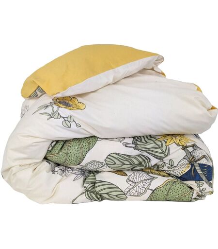 HOUSSE DE COUETTE TOCO VERT 260x240 CM Thème nature et exotisme pour cette parure de lit avec une composition déco motif toucans au milieu d'un décor végétal luxuriant dans des tons de vert amande, bleu et moutarde sur un fond écru. La collection linge de lit TOCO en percale de coton plongera votre chambre dans un univers nature et exotisme pour une déco jungle. Housse de couette reversible avec une face imprimée d'un motif en parement en partie basse de toucans au milieu d'un décor végétal luxuriant dans des tons de vert amande, bleu et moutarde et fond uni écru en partie haute, sur l'autre face un fond jaune moutarde. Finition rabat de maintien de 37 cm aux pieds, forme cheminée . Linge de lit 100% coton très doux avec un tissage 57 fils/cm2 très serrés pour une grande résistance et une excellente tenue. Composez vous même votre parure à vos dimensions de lit grâce à tous les articles disponibles en vente à l'unité. La collection TOCO est fabriquée en France. Côté technique : ...