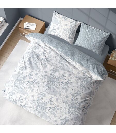 PARURE DE LIT TOILE 260x240 CM Parure de lit imprimée composée d'une housse de couette 260x240 cm et 2 taies d'oreillers 63x63 cm Ambiance monochrome avec cette parure de lit reversible imprimée de feuilles et brindilles crayonné en gris bleu sur fond blanc. La collection linge de lit TOILE de qualité coton Topcool est idéale pour une décoration de chambre intemporel. Le Topcool est une fibre thermorégulante composée de coton et de polyester sous forme de microfibres qui favorise l'évacuation de l'humidité apportant un meilleur confort la nuit. Housse de couette avec deux faces imprimées différentes, sur une face imprimée de feuilles et brindilles gris bleu sur fond blanc, sur l'autre un all-over de brin de fleur blanche sur fond uni. Finition sans rabat aux pieds, fermeture par boutons, et passe-mains pour enfiler la couette facilement. Taie d'oreiller carrée avec deux faces imprimées différentes coordonnées à la housse de couette. Finition simple, forme portefeuille avec un rabat ...
