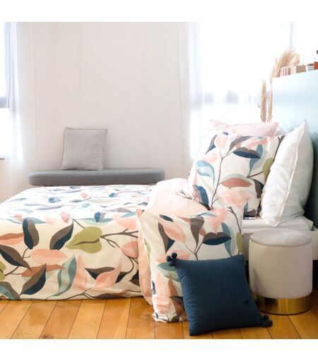 PARURE DE LIT LILA 240x220 CM Parure de lit imprimée composée d'une housse de couette 240x220 cm et 2 taies d'oreillers 63x63 cm Ambiance graphique avec cette parure de lit 2 personnes avec un imprimée de très grandes feuilles en aplat de couleurs pastels sur tiges. La collection linge de lit LILA en coton adouci est idéale pour une décoration de chambre coloré et moderne. Housse de couette réversible avec sur une face un imprimé de très grandes feuilles en aplat de couleurs pastels sur tiges dans des tons de bleu, rose et marron sur fond blanc, sur l'autre face un uni rose poudré. Finition sans rabat aux pieds, fermeture par boutons, et passe-mains pour enfiler la couette facilement. Taie d'oreiller carrée avec deux faces imprimées identiques motif coordonné à la housse de couette. Finition simple, forme portefeuille avec un rabat intérieur. Côté technique : Matière : Coton BCI adouci 57 fils/cm2 Qualité : 110 g/m2 Couleurs garanties grand teint Housse de couette 240x220 avec ...