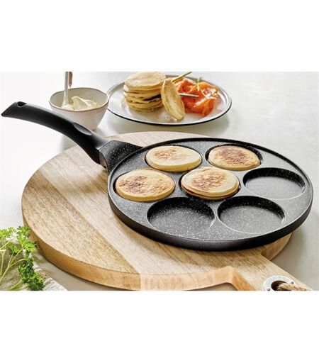 Cette poêle à blinis contient 7 empreintes épaisses pour cuire 7 blinis ou pancakes, en même temps ! Légère et facilement maniable. Corps en fonte d'aluminium et revêtement intérieur effet pierre aux propriétés anti-adhérentes. Dim. 26 x 1,5 cm. Lave-vaisselle. Compatible tous feux (dont induction). ...