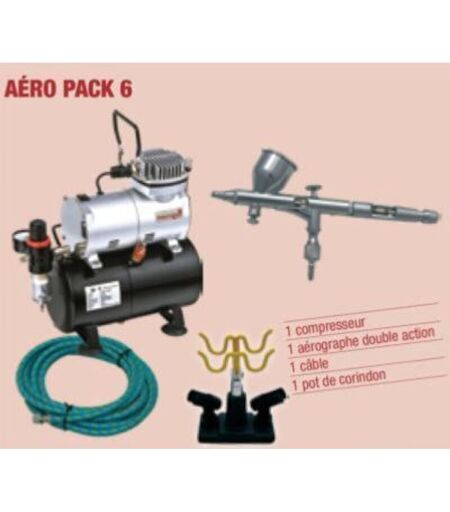 AEROGRAPHE DOUBLE-ACTION: Cet aérographe double action se caractérise par ses nombreux réglages. Très pratique, la vis de réglage placée sous le godet permet de régler facilement la largeur du trait en cours d'utilisation, passant d'un trait de plusieurs centimètres au trait le plus fin. Facilement nettoyable et démontable, il est tout en acier inoxydable. Caractéristiques techniques : Type d'alimentation : godet par gravité Diamètre de buse : 0.25mm Capacité du pot : 9CC Raccord 1/8 Une pochette de pièces de rechange est disponible sous la référence 3700441. COMPRESSEUR: Ce compresseur à cuve est de type à piston et membrane sèche, sans huile, et ne nécessite aucun entretien tout au long de sa vie. Petit, léger, facilement transportable, il est très silencieux et fiable. Idéalement conçu pour le matériel d'aérographie. Caractéristiques techniques : Air aspiré : 23 litres/mn Pression maxi : 4 bars Niveau sonore : 38 dB(A) Moteur : 90 W - 220 V Dimensions : 31 x 13 x 31 cuve : 3,0 ...