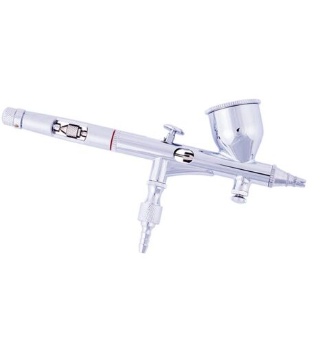 Cet aérographe double action se caractérise par ses nombreux réglages. Très pratique, la vis de réglage placée sous le godet permet de régler facilement la largeur du trait en cours d'utilisation, passant d'un trait de plusieurs centimètres au trait le plus fin. Facilement nettoyable et démontable, il est tout en acier inoxydable. Caractéristiques techniques : Type d'alimentation : godet par gravité Diamètre de buse : 0.25mm Capacité du pot : 9CC Raccord 1/8 Une pochette de pièces de rechange est disponible sous la référence 3700441. ...