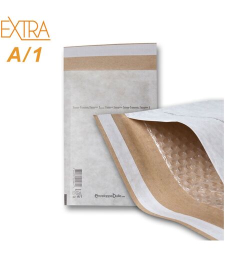 Type A/1 gamme EXTRA (plus résistantes que les gammes PRO et ECO) - Format intérieur 90 x 160 mm * - Format extérieur 120 x 175 mm* *dimensions +/- 20mm - Fermeture par bande autocollante détachable - Papier kraft blanc marbré 125 g/m2 (appelé aussi kraft nuageux) - Film bulles d'air polyéthylène tricouche 70 microns - Bulles de diamètre 10 mm, d'épaisseur 4 mm Type Format intérieur * Format extérieur* Exemples d'utilisation A/1 90x160mm 120x175mm Bijoux, perles, pin's, broches, petites figurines, minidiscs B/2 120x215mm 140x225mm Montres, colliers, téléphones, clés USB, format A6,... C/3 150x215mm 170x225mm CD avec boîtier, format A5,... D/4 180x265mm 200x275mm DVD avec boîtier, Mangas, format A5+,... E/5 220x265mm 240x275mm Livres, K7 VHS, ... F/6 220x335mm 240x345mm Livres moyens,... G/7 240x335mm 260x345mm Magazines, classeurs, format A4,... H/8 270x360mm 290x370mm Bande-dessinées, gros livres, catalogues, format A4+,... J/9 300x445mm 320x455mm Vêtements, certificats, diplômes, ...
