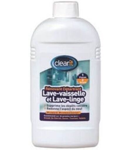 Merci de vérifier que cette pièce est bien compatible avec votre modèle d'appareil. Notre service client peut vous conseiller.Nettoyant détartrant lave-linge et lave-vaisselle de la gamme Clearit.Elimine les dépots calcaires, redonne l'aspect du neuf.Supprime les depots calcaires a l'intérieur des appareils.Redonne l'aspect du neuf aux résistances chauffantes et cuves inox.S'utilise a raison d'un demi flacon par opération.. ...
