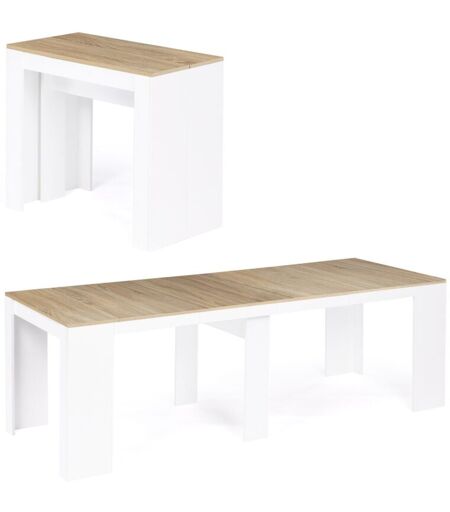 Description générale La table console extensible ORLANDO en bois blanc et façon hêtre est le meuble parfait pour allier fonctionnalité et design. Idéale pour les repas en famille ou entre amis, elle peut accueillir jusqu'à 10 personnes grâce à ses dimensions généreuses. Une fois repliée, elle se transforme en une console compacte, parfaite pour un hall d'entrée ou un coin salon. Spécifications techniques Dimensions table étendue : Longueur 235 cm x largeur 90 cm x Hauteur 75 cm Dimensions console repliée : L. 90 x l. 45 x H. 75 cm 4 rallonges de 47 cm chacune Matériaux : Panneaux de particules de 1,5 cm d'épaisseur Coloris : Blanc et bois À monter soi-même Compatibilité et accessoires Compatible avec divers styles de décoration intérieure Peut être associée à d'autres meubles de la collection design Installation Livrée avec un kit de montage et une notice d'assemblage Installation facile grâce à un système de montage simple Utilisation Idéale comme table à manger ou comme meuble ...