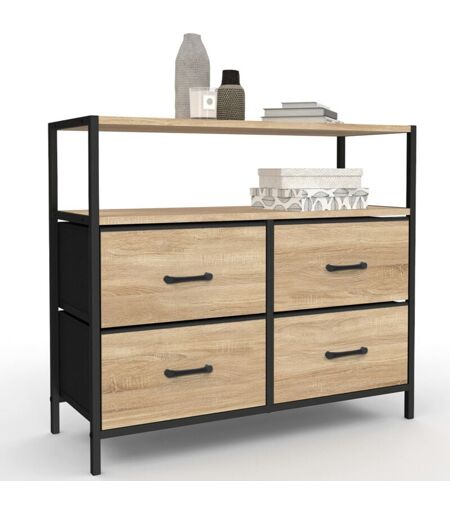 DESCRIPTION GÉNÉRALE Optez pour la commode UTAH au design industriel bi-matière. Ses 4 tiroirs en tissu ont une façade effet bois. Cette commode astucieuse et design est idéale pour ranger vos vêtements, même les plus volumineux. Sa structure en métal est surmontée d'un plateau en PB effet bois, parfait pour y déposer des objets décoratifs ou une lampe. Avec son look industriel, elle s'intègre facilement dans n'importe quelle pièce. SPÉCIFICATIONS TECHNIQUES Dimensions hors tout : Longueur 80 cm x largeur 30 cm x Hauteur 70 cm Dimensions intérieures d'un tiroir : L. 37 cm x l. 28.5 cm x H. 18 cm Dimensions façade d'un tiroir : L. 37 cm x H. 19 cm Dimensions de la niche entre le tiroir supérieur et l'étagère : 18 cm Dimensions des poignées : L. 10 cm x l. 2 cm Hauteur des pieds : 7 cm Structure en métal, tiroirs en fibre non tissée et façades en particules de bois (PB) Coloris : noir et effet bois À monter soi-même ...