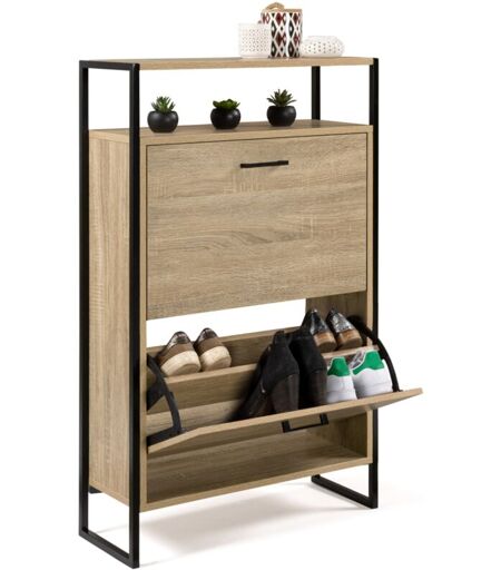 Description générale Ce meuble à chaussures au design industriel a une capacité de 12 paires, réparties en 6 paires par compartiment. Grâce à ses portes à ouverture abattante, il offre un accès facile tout en optimisant l'espace. Sa structure en métal noir et son bois imitation hêtre lui confèrent robustesse et élégance, ce qui en fait un ajout attrayant à votre vestibule. Spécifications techniques Dimensions globales : Longueur 63,2 cm x Largeur 23,5 cm x Hauteur 101,5 cm Hauteur de l'étagère : 13 cm Hauteur des portes basculantes : 35 cm Prévu pour des pointures allant jusqu'au 41 Hauteur des pieds : 10 cm Matériaux : Bois imitation hêtre et métal À monter soi-même Compatibilité et accessoires Modèle disponible en version 4 portes avec étagère Installation À fixer au mur pour éviter tout risque de basculement Utilisation Idéal pour ranger des chaussures et garder votre espace organisé Peut également servir d'étagère pour exposer des objets décoratifs ...
