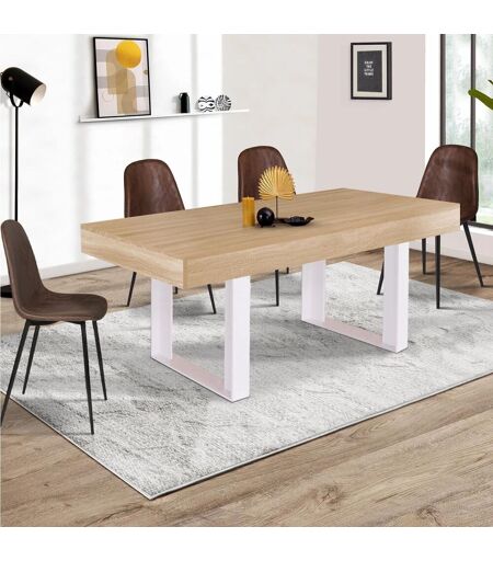 Vous avez envie d'un esprit loft chic et design pour votre salle à manger ou votre cuisine ? Découvrez la table à manger bois et blanc PHOENIX 160 cm. Elle s'intègre parfaitement dans les grands comme dans les petits espaces, pour un prix imbattable. Partagez des moments conviviaux autour de cette table en famille ou entre amis jusqu'à 6 personnes ! Descriptif de la table moderne rectangulaire 160 cm Vous aimez recevoir ? Vous recherchez la table idéale qui vous permettra de passer d'agréables repas entre amis ou en famille ? La table à manger 6 personnes PHOENIX d'une longueur de 160 cm vous permet d'accueillir jusqu'à 6 convives. Repas de famille, soirée entre amis... la table à manger 6 personnes est parfaite pour passer un moment convivial ! Grâce son plateau en bois effet naturel et ses pieds en bois blanc, la table PHOENIX apportera une touche lumineuse et résolument chic à votre salle à manger ou à votre cuisine. Elle deviendra l'élément central de votre déco. Elle trouvera tout aussi bien sa place dans une salle à manger style loft dont elle renforcera le style, que dans un intérieur plus traditionnel, auquel elle donnera une touche design. La forme rectangulaire de son plateau permet à la table bois et pieds blancs de s'adapter à de nombreuses configurations d'aménagement d'espaces. Ses dimensions 160 x 90 cm sont à la fois généreuses et modérées. La table est suffisamment grande pour recevoir, sans pour autant encombrer votre intérieur. Choisissez cette table à manger PHOENIX à un prix mini ! Dimensions de la table en bois et pieds blancs Dimensions globales : Longueur 160 cm x largeur 90 cm x Hauteur 78 cm Dimensions du plateau : L. 160 x l. 90 x H. 12 cm Dimensions des pieds : l. 12,5 x H. 76 cm Espace entre l'extrémité du plateau et le pied : 20 cm Espace entre chaque pied : 100 cm Épaisseur du plateau bois : 1,8 cm Épaisseur des pieds bois : 1,5 cm Capacité : 6 personnes Matériaux : Particules de bois mélaminés À monter soi-même Ce modèle de la gamme PHOENIX existe également dans d'autres coloris : - Table extensible 160 cm bois gris - Table extensible 160 cm bois noir Découvrez l'ensemble de nos tables à manger modernes. La table à manger extensible PHOENIX 160 cm bois et blanc est idéale pour tous types d'intérieur Avec son plateau de 160 cm de longueur, accueillez famille et amis ! Avec sa capacité d'accueil de 6 personnes, vous partagerez de bons moments avec vos convives Design effet loft ultra tendance - Plateau (ép. 1,8 cm) et pieds (ép. 1,5 cm) en bois mélaminé Structure à l'aspect massif et robuste : stabilité et qualité garanties Nos + produit Design loft tendance Tous types d'intérieurs Accueille jusqu'à 6 personnes Structure à l'aspect massif et robuste ...