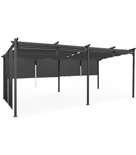 DESCRIPTION GÉNÉRALE Profitez de votre terrasse et de votre espace extérieur grâce à la pergola toit rétractable de 6x3m. Cette tonnelle avec stores latéraux intégrés vous protège des rayons du soleil tout en vous permettant de profiter des belles journées d'été. Sa conception astucieuse vous offre un large espace pour recevoir vos invités ou créer un double espace : côté repas et côté détente. La pergola gris anthracite s'adapte à vos besoins : créez un espace ombragé en tendant les toiles ou laissez passer le soleil en les rétractant. Vous pouvez également installer les stores enrouleurs inclus pour un ombrage supplémentaire. SPÉCIFICATIONS TECHNIQUES Dimensions de la pergola : 3 x 6 m Dimensions totales : Longueur 590 cm x largeur 290 cm x Hauteur 220 cm Dimensions des pieds : 60 x 60 mm Distance entre les pieds : 258 cm (côtés de 3m) / 276 cm (côtés de 6m) Poutres supérieures : H. 60 x l. 30 x ép. 0,7 mm Structure en métal gris foncé Toile : 100 % polyester 180 gr/m² 2 stores ...
