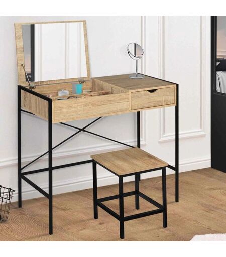 Coiffeuse multifonctions LUIS Multifonctions, coiffeuse, console, ou bureau, ce meuble polyvalent se transforme selon vos envies et vos besoins en un instant ! Idéal pour les petits espaces grâce à son miroir rabattable pratique qui permet d'économiser de l'espace. Rabattu, le miroir se transforme en une surface de travail facile à nettoyer. Avec son design industriel et moderne, la coiffeuse LUIS s'intègre parfaitement dans votre intérieur, que ce soit dans la chambre, le bureau, la salle de bain ou l'entrée. Caractéristiques : 4 grands compartiments cachés pour ranger bijoux, maquillage et accessoires Tabouret assorti facile à glisser sous la coiffeuse pour un gain de place Tiroir coulissant avec poignée encoche demi-lune pour un rangement supplémentaire Structure et pieds en métal pour une stabilité et robustesse optimales Couleur naturelle et intemporelle pour s'adapter à tout type de décoration En acquérant la coiffeuse miroir rabattable LUIS, vous disposez d'un espace agréable et fonctionnel pour vous coiffer et vous apprêter. Les dimensions de la coiffeuse sont les suivantes : Longueur 83 cm x largeur 39,5 cm x Hauteur 75,5 cm. Les dimensions du tabouret sont : L. 35 x l. 35 x H. 40,5 cm. La hauteur totale avec le miroir ouvert est de 113 cm et les dimensions du miroir sont : L. 38,5 x H. 36 cm. Les matériaux utilisés sont des panneaux de particules de bois et du métal. La coiffeuse est à monter soi-même. Retrouvez toute notre gamme de coiffeuses sur notre boutique en ligne ! ...