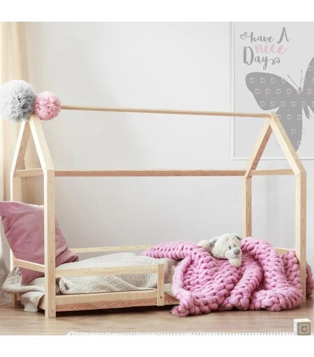 Votre enfant rêve d'une cabane d'aventurier dans sa chambre ? Faites-lui plaisir avec ce super lit cabane enfant 90x190 cm avec sommier et barrières pas cher ! Créez un espace détente et cocooning dans la chambre à coucher de votre enfant avec le lit cabane NESSI 2-en-1 90x190 cm bois pour de purs moments de jeux et des nuits pleines de rêves. Une rambarde en bois présente sur chacun des côtés du lit, vient également encadrer le matelas et apporte une sécurité supplémentaire pour éviter à votre enfant les risques de chutes de part et d'autre du lit. Descriptif du lit cabane 90 x 190 CM bois Quel enfant n'a jamais rêvé d'avoir une cabane dans sa propre chambre ? Grâce à ce lit cabane pas cher, votre enfant pourra développer son imagination et vivre plein d'aventures ! Moitié cabane moitié lit, ce meuble à petit prix deviendra à la fois un espace de jeux et de couchage. Inspiré de la méthode d'éducation Montessori, le lit cabane blanc est placé à même le sol, ce qui donne beaucoup d'autonomie à l'enfant qui peut aller se coucher et se lever seul. De plus, son design de style scandinave est chaleureux et rassurant pour les tout-petits. Avec une jolie couleur en bois naturel et des lignes épurées, il plaît autant à une petite fille qu'à un petit garçon. Grâce à la rambarde en bois présente des deux côtés du lit cabane au sol bois, votre enfant pourra jouer et dormir en toute sécurité. Le matelas est parfaitement encadré, il n'y a donc aucun risque de tomber. Une entrée de 115 cm permet d'accéder facilement au lit. Enfin, avec sa structure en pin et son sommier 13 lattes en contreplaqué, le lit enfant cabane apporte beaucoup de confort tout en étant très solide. La forme du lit cabane 90x190 cm a été spécialement pensée pour éviter de se cogner. Offrez un petit nid douillet à votre enfant pour qu'il puisse faire de beaux rêves ! Lit vendu sans matelas Dimensions du lit cabane enfant NESSI bois - Dimensions globales : Longueur 195 CM x largeur 97 CM x Hauteur 135 CM - Dimensions intérieures : 90 x 190 CM - Matière de la structure : Bois de pin - Couleur de la structure : Bois - Épaisseur de la structure : 3,5 CM - Épaisseur du bois des rebords/barrières : 2 CM - Hauteur des rebords/barreaux : 37,5 CM - Matière des lattes : Contre-plaqué - Nombre de lattes : 13 lattes - Distance entre les lattes : 8 CM - Largeur des lattes : 6 CM - Épaisseur des lattes : 1 CM - Hauteur du sommier 9,5 CM - Longueur de l'ouverture à droite du lit : 115 CM Ce modèle de lit cabane NESSI pour enfant existe dans d'autres coloris : - Lit cabane enfant NESSI 90x190 CM blanc - Lit cabane enfant NESSI 90x190 CM gris Retrouvez également nos autres modèles de lit disponibles sur notre boutique en ligne ! Réalisez le rêve de vos enfants et offrez-leur ce joli lit-cabane NESSI 90 x 190 CM ! Pour les adeptes de la décoration d'inspiration scandinave et de la méthode 'Montessori' ! Ce petit refuge à la couleur tendance bois naturel finira de parfaire la décoration de leur chambre... ...