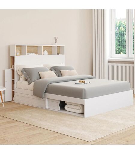 Points forts Style moderne et chaleureux Nombreux espaces de rangement Design fonctionnel et tendance Structure massive et robuste Lit double CLEM avec tête de lit, rangements et sommier 140 x 190 cm blanc Apportez une note de modernité à votre chambre à coucher avec le lit double 140x190 cm bicolore blanc et bois CLEM. Très fonctionnel, ce lit double est composé d'une structure avec 2 compartiments et d'une grande tête de lit avec rangements. Un lit deux places design et malin à petit prix ! Descriptif du lit double blanc avec sommier Vous rêvez d'avoir un lit 2 places esthétique, confortable et pratique ? Grâce au lit double blanc et bois façon hêtre CLEM, vous avez la solution ! Le sommier avec rangement 140x190 cm composé de 10 lattes votre offre un couchage de qualité. Choisissez un matelas double standard. Ce lit double est équipé de deux compartiments qui s'ouvrent et se ferment à l'aide de portes latérales coulissantes. Organisez ainsi le rangement de vos couettes, de vos couvertures et des vêtements de la saison précédente. Disposez un réveil, une lampe de chevet et un livre dans les niches de la tête de lit. Placez vos affaires personnelles à l'abri des regards dans les placards latéraux. Le lit double CLEM avec rangement s'intègre parfaitement à votre intérieur grâce à la pureté de ses lignes ainsi qu'à ses couleurs épurées effet bois et blanc. Le design sobre et tendance de ce lit 140x190 avec rangements blanc et hêtre et tête de lit apporte une touche de fraîcheur et de luminosité à votre chambre à coucher. À la fois pratique et esthétique, ce sommier avec tiroirs de rangement 140x190 cm ultra fonctionnel peut trouver sa place dans votre chambre à coucher ou dans une chambre d'amis. N'attendez plus et optez pour le lit double avec rangements, tête de lit et sommier blanc 140x190 CLEM à prix coup de coeur ! Dimensions du lit double avec rangement 140x190 cm Dimensions globales : Longueur 213 cm x largeur 145 cm x Hauteur 120 cm Dimensions du cadre de lit : L. 195 x l. 145 x H. 30 cm Nombre de lattes : 10 Hauteur des portes coulissantes : 17,5 cm Dimension intérieure des 2 compartiments : 95 x 60 x 23 cm Dimensions globales de la tête de lit : L. 145 x l. 20 x H. 120 cm Dimensions des 2 grandes niches frontales : L. 44,6 x l. 20 x H. 21 cm Dimensions des 2 petites niches frontales : L. 24,15 x l. 20 x H. 21 cm Dimension des niches latérales : L. 17 x l. 25 x H. 21,5 cm Porte avec ouverture pression + 2 étagères intérieures Dimensions des portes latérales : L. 17 x l. 25 x H. 71,5 cm Matériaux : panneaux de particules / bois pour les lattes Coloris : blanc et bois À monter soi-même ...