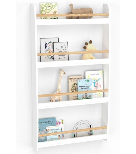 Vous rêvez d'une chambre toujours bien rangée pour votre enfant ? Craquez pour la bibliothèque murale PAULETTE blanc et bois et mettez toutes les chances de votre côté ! Avec son design moderne et épuré, cette bibliothèque murale est parfaite pour organiser l'univers de votre enfant tout en optimisant l'espace. Ce beau meuble de rangement pour enfant blanc et bois offre une grande capacité de rangement à petit prix, avec ses 4 étagères pour conserver une chambre bien ordonnée.Grâce à ses 4 étagères horizontales blanches et leur barre anti-chute en bois, les livres sont maintenus sans risque de tomber. Votre enfant peut ainsi voir toutes ses histoires en un clin d'œil, ce qui l'incite à lire et à choisir ses livres seul. Les différentes histoires, dessins ou petits jouets trouveront aisément leur place sur ces 4 étagères. Pratique, la structure murale permet de garder le sol dégagé : idéale pour les chambres d'enfant ou les salles de jeux. Vous pourrez la fixer au mur à la hauteur ...