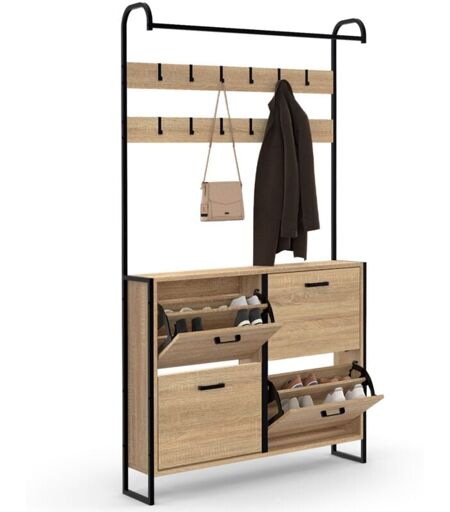 Grâce au meuble d'entrée LUIS, tout est à portée de main ! Accrochez vos vestes et manteaux à ses 12 patères tout en rangeant vos chaussures dans l'un des quatre tiroirs.Vous pouvez y ordonner jusqu'à 24 paires de chaussures, 6 paires par compartiment. Profitez du dessus du rangement à chaussures pour poser vos clés ou votre sac à main. Les 12 patères du portant, en métal noir permettent de suspendre facilement et rapidement vos manteaux, vestes, écharpes, sacs et autres vêtements.Toute la famille trouvera une place pour ranger son manteau ou ses chaussures à l'abri de la poussière ! Les 4 espaces de rangement à chaussures sont séparés par une cloison intermédiaire pour organiser votre dressing à chaussures. Le format des portes, gain de place et astucieux, permet une ouverture facilitée.Organisez votre entrée tout en restant tendance, le design bois et métal du vestiaire LUIS apportera une touche déco industrielle à votre intérieur. Profitez de ce splendide vestiaire d'entrée ...
