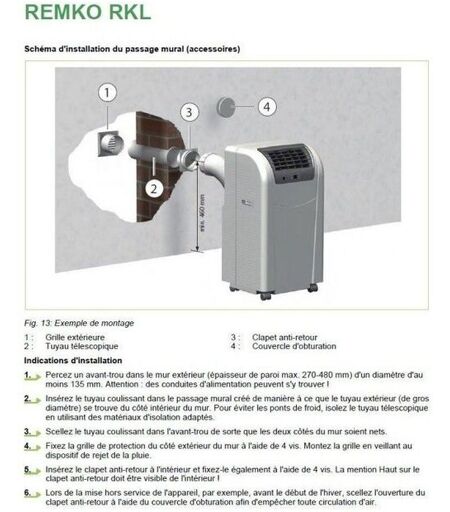 Passage Mural pour évacuation Diamètre 135 mm / Accessoire pour Climatiseur Remko RKL - 1613118. Permet l'évacuation de l'air chaud au travers d'un mur. Fonctionne avec les Climatiseur REMKO RKL : - RKL 491 - RKL 300 - RKL 360 Made in Germany Tous les produits de la marque Remko sont garanties 2 Ans pièces & mains d'oeuvres avec prise en charge des frais de transport retour usine en cas de panne & réexpédition à votre domicile. Merci de conserver l'emballage d'origine. ...