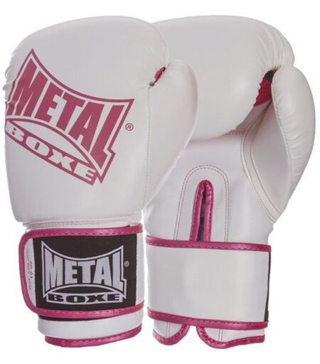 Gants de Boxe Entrainement METAL BOXE Blanc. Nouveauté 2015-2016 avec le Top des ventes Gants Entrainement Débutants de la marque Française décliné en Blanc Mat avec Liseret Rose spécial Filles. Un gant très performant pour une pratique régulière. Mousse injectée pour un très bon confort et une bonne absorption. Fermeture au poignet par large bande velcro. Très bon maintien et serrage efficace. Ces gants restent toutefois des gants ""débutants"" ou initiation assez souples aussi il est déconseillé de les utiliser pour de la frappe au sac intensive sous peine de les déformer. Rapport qualité/prix imbattable. Caractéristiques : - Enveloppe PU, - Intérieur doublure Nylon, - Barre de Préhension, - Manchette longue avec fermeture et serrage par large bande Velcro, - Pouce Attache simple, - Renfort de la paume de la main. Conseil choix de la taille (sans obligation): -Moins de 59Kg : 8 Oz, -Plus de 59 Kg : 10 Oz. ...