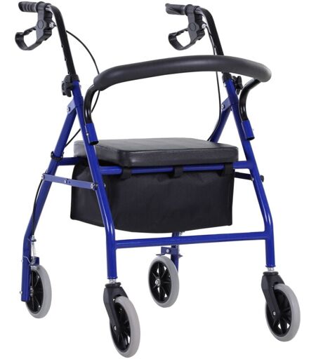 HOMCOM Déambulateur 4 roues - déambulateur pliable léger - assise + dossier rembourré - poignées ergonomiques, freins à main - panier rangement - métal bleu