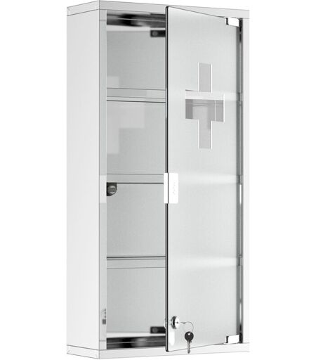HOMCOM Armoire à pharmacie 3 étagères 4 niveaux 30L x 12l x 60H cm porte verre trempé symbole croix acier inoxydable brossé