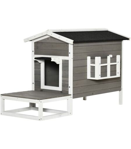 PawHut Maison lodge sur pied - niche villa chat petit chien - terrasse, toit bitumé, jardinière, 2 portes - bois sapin pré-huilé peint