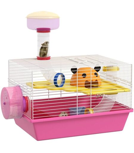Pawhut - Cage à hamster rat rongeur - plateforme, biberon eau, roue, maisonnette, tubes - acier blanc pp rose