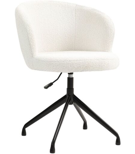 DESCRIPTION GÉNÉRALE Découvrez notre joli siège de bureau ergonomique. Son revêtement bouclette rappelle le style moderne scandinave. Avec ses lignes arrondies et son assise enveloppante, il offre un grand confort. Réglable en hauteur et pivotant, il allie praticité et élégance pour une touche rétro dans votre intérieur. SPÉCIFICATIONS TECHNIQUES Couleur : blanc crème Matériaux : tissu 100% polyester, rembourrage mousse Dimensions totales : 62l x 64P x 83-89H cm Dimensions assise : 43l x 48P cm Hauteur assise : 54-60 cm Hauteur dossier : 41 cm Charge maximale recommandée : 120 kg Réf. : 921-724V00CW ...