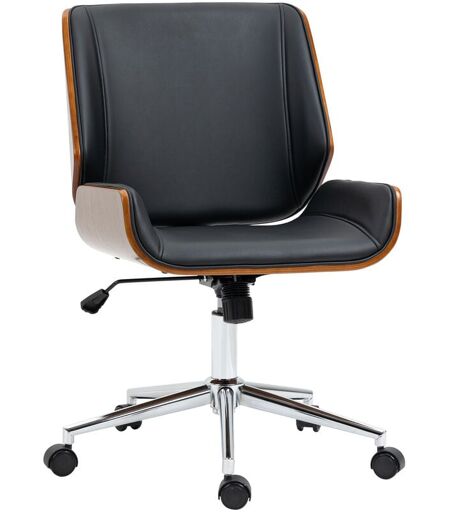 Cette jolie chaise de bureau ergonomique au style vintage mêlant bois, revêtement synthétique et piètement chromé allie simplicité et modernité. L'installer dans votre bureau apportera une touche d'élégance supplémentaire à votre pièce. Réglable en hauteur, pivotante à 360°, c'est la chaise de bureau confortable qu'il vous faut. Le rembourrage de haute densité de l'assise vous offrira le confort attendu. Caractéristiques: - Fauteuil ergonomique design vintage avec coque conçue en bois et revêtement assise en synthétique noir pour sublimer votre intérieur; - Garnissage mousse haute densité de l'assise et conception ergonomique pour assurer votre confort durant de longues heures de travail; - Réglable en hauteur vous permettant d'optimiser votre position; - Assise revêtement synthétique très facile d'entretien; - Piètement chromé 5 branches avec 5 roulettes multidirectionnelles; - Montage rapide et facile à l'aide du manuel d'assemblage illustré fourni Spécifications: - Couleurs : noir, ...