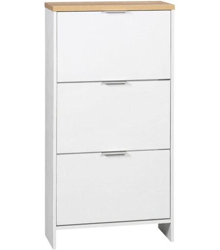 Description générale Ce joli meuble à chaussures sera idéal dans votre entrée, dressing, etc. Disposant de 3 portes abattantes à double compartiment, vous pourrez ranger et ordonner vos chaussures comme bon vous semble. Ergonomique et d'un style contemporain bicolore aspect chêne clair et blanc, ce meuble de rangement habillera parfaitement votre intérieur. Spécifications techniques Couleurs : aspect chêne clair et blanc Matériau principal : MDF Dimensions totales : 60L x 24l x 120H cm Dimensions des portes : 56,5L x 35H cm Charge max. recommandée totale : 15 Kg Référence : 837-317V00WT Compatibilité et accessoires Fournie avec un manuel d'assemblage illustré pour vous guider au montage Dispositif arrière anti-basculement Installation Montage facile grâce au manuel illustré inclus Utilisation Peut accueillir jusqu'à 12 paires de chaussures selon les pointures Idéal pour optimiser l'espace de rangement dans votre hall d'entrée ou dressing ...