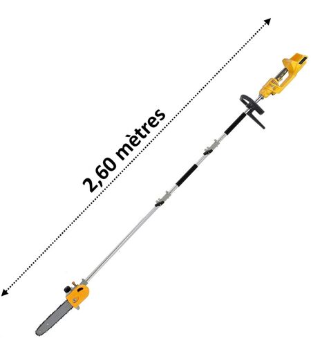 Cette élagueuse sur perche vous permet d'atteindre les endroits les plus difficiles grâce à sa portée de 2,60 mètres. Elle est équipée d'un guide et d'une chaîne de marque OREGON pour une coupe nette et précise. Ce taille-haies sur perche sans fil fonctionne avec une batterie lithium-ion compatible avec tous les outils de la gamme GT ELEC. Vous pourrez ainsi travailler en toute autonomie sans être gêné par un cordon d'alimentation. Les batteries GT ELEC 40 Volts sont puissantes et durables grâce à la dernière technologie Samsung. Caractéristiques techniques : - Marque française : GT ELEC - Alimentation : Batterie lithium-ion 40 Volts - Homologation : CE, GS - Batterie : Lithium-ion 40 Volts : 2 Ah ou 4 Ah au choix (avec témoin de charge) - Autonomie de la batterie (en continu) : Batterie 2 Ah : 25 mn, batterie 4 Ah : 50 mn - Temps de charge de la batterie : Batterie 2 Ah : 65 mn, batterie 4 Ah : 130 mn - Longueur totale de la perche : 2,60 mètres - Tête orientable de 0° à 90° (5 ...