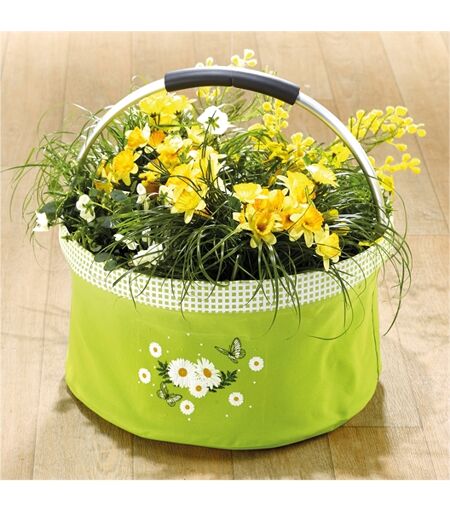 Ce panier singulier accueille volontiers vos fleurs, plantes ou compositions mêlées. Avec sa belle contenance, sa forme repliable et son joli motif printanier, il fait des merveilles décoratives ! En plus, vous apprécierez son côté imperméable qui simplifie l'arrosage ! En polyester, synthétique et manche en métal. Contenance : 16 L. Dimensions 35 x 34 cm. ...
