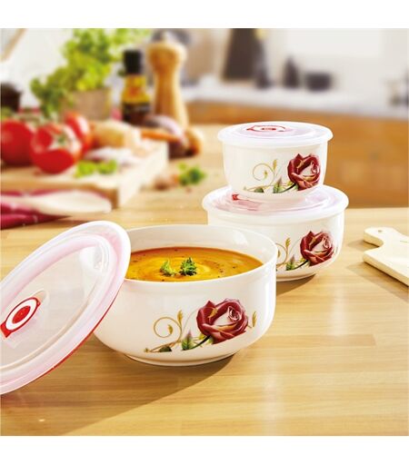 Réalisées en matière céramique, ces boîtes sont idéales pour la cuisson au micro-ondes : une valve sur le couvercle en plastique laisse échapper la vapeur. Vos préparations culinaires restent ainsi moelleuses et ne sèchent pas. Avec leur joli décor, ces boîtes passe-partout passent à table avec beaucoup de style. Elles permettent également une bonne et meilleure conservation de vos préparations dans le réfrigérateur. Des jolies boîtes pour réchauffer ou conserver vos préparations culinaires Ces boîtes en céramique passent au micro-ondes pour réchauffer vos préparations, restes ou repas. Elégantes et proposées en plusieurs dimensions, elles vous rendront de grands services et feront autant merveille à table pour le service, qu'au réfrigérateur pour assurer une meilleure préservation des aliments. - Dimensions : 16,5 x 7,5 cm env. (800 ml) ; - Dim. 13,5 x 6,5 cm env. (500 ml) - Dim. 10,5 x 5,5 cm env. (200 ml) - Passent au lave-vaisselle - Lot de 3 - Couvercle équipé d’une valve vapeur ...