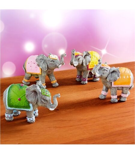 A défaut davoir des pouvoirs magiques, ces quatre éléphants richement harnachés ont un incontestable pouvoir décoratif ! Ils sont peints à la main, dans différentes couleurs. Lot de 4. Résine. Dim. 11 x 9 x 6 cm env. ...