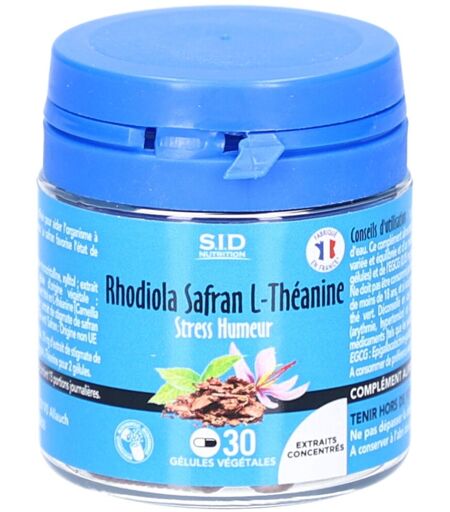 Complément alimentaire à utiliser dans le cadre d’une alimentation variée, équilibrée et d’un mode de vie sain.La Rhodiola est traditionnellement utilisée pour contribuer à la résistance au stress, et le Safran pour aider à la relaxation.IngrédientsRacine de rhodiola, extrait de stigmate de safran, extrait de feuille de thé vertValeurs nutritionnellesExtrait de rhodiola (racine) équiv. 400 mg100 mg/Extrait de stigmate de safran15 mg/Extrait de feuille de thé vert dont L-Théanine52,5 mg (dont 20 mg)/Conseils d'utilisation1 à 2 gélules par jourPrécautions d'emploiCe complément alimentaire doit être utilisé dans le cadre d’une alimentation variée et équilibrée et d’un mode de vie sain.Contient de la caféine (0,5 mg pour 1 gélule) et de l’EGCG (0,025 mg pour 1 gélule).Ne doit pas être consommé à jeun, par les femmes enceintes ou allaitantes et par les enfants de moins de 18 ans, et si vous prenez le même jour d’autres produits contenant du thé vert. Déconseillé aux personnes sous antidépresseurs.A conserver à l’abri de la lumière, de la chaleur et de l’humidité. Tenir hors de portée des jeunes enfants. Ne pas dépasser la dose recommandée.Poids net30 gélulesAdresse du FabricantSID NUTRITIONAvenue de Provence13190 Allauch ...