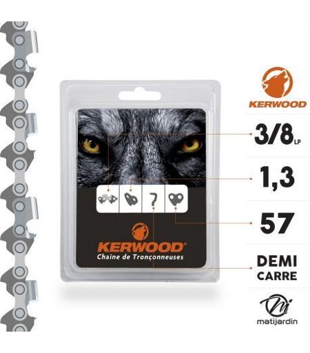 Chaîne Kerwood pour tronçonneuse 3/8" LP 1,3 mm. 57 maillons. Gouge profil demi carré