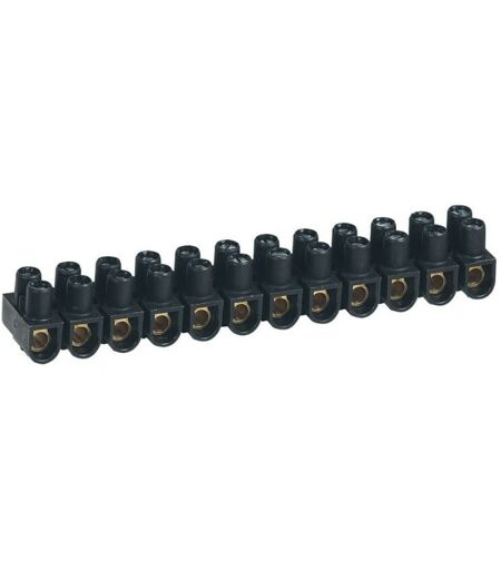 Vendu par Pack de 10 unités. Section du c‚ble: 6mm2. Nombre de pôles: 12. Température maximale approximative ∫C: 105. Ampérage: 5-32A. Tension: 400V. Mesures en mm: 114x19x16. Barrettes de connexion économiques, semi-rigides, ignifuges. en polyamide avec contacts en laiton et vis en relief et goupilles de sécurité en acier galvanisé. Normes CE (BS EN 60998). Couleur: noir. ...