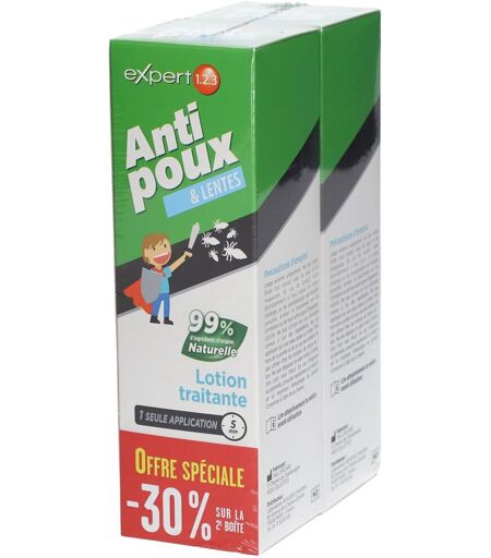 Expert 1.2.3 Anti-Poux et Lentes Lotion traitante est un dispositif médical de classe I indiqué dans le traitement des poux et des lentes chez l’adulte et l’enfant dès 3 ans. Formule à base d’acides gras de coco et d’huile végétale, sans substances neurotoxiques, elle élimine 100% des poux et des lentes en 1 seule application. Indications Lotion traitante Anti-poux et lentes 99% d'ingrédients d'origine naturelle 1 seule application : 5min 100% efficace Dès 3 ans Conseils d'utilisation Agiter le flacon avant emploi. Ouvrir la canule. Appliquer la lotion avec l’embout applicateur sur le cuir chevelu et les cheveux légèrement humides afin de les recouvrir entièrement. Masser le cuir chevelu pendant 5 minutes pour homogénéiser l’application. Bien insister au niveau de la nuque et de l’arrière des oreilles. Placer la charlotte sur les cheveux et laisser poser 5 min pour une action sur les poux et 1h pour une action sur les lentes. Passer soigneusement le peigne dans les cheveux pour éliminer les poux et les lentes. Si vous en ressentez le besoin, appliquer votre shampooing habituel. Bien refermer le flacon après utilisation. En cas de très forte infestation, et si cela est nécessaire, répéter le traitement 10 jours après la première application. Précautions d'emploi Lire attentivement les précautions d'emploi avant utilisation. Usage externe uniquement. Ne pas appliquer sur une peau lésée ou irritée. Ne pas avaler. Éviter tout contact avec les yeux et les muqueuses. En cas de contact, rincer abondamment à l’eau claire. Un risque d’allergie ou de sensibilisation est toujours possible, arrêter le traitement en cas d’irritation ou de tout autre signe d’hypersensibilité. Ne pas utiliser en cas d’allergie connue à l’un des ingrédients. Tenir hors de la portée et de la vue des enfants. Ne pas utiliser chez les enfants de moins de 3 ans. Ne pas dépasser la date limite d’utilisation (voir sous l’étui).En cas d’indigestion accidentelle, consulter rapidement un médecin en lui montrant l’étiquetage du produit. Conserver à l’abri de la chaleur. Femmes enceintes ou en période d’allaitement, demander conseil à un professionnel de santé. Composition Eau, acides gras d'huile de coco, sels de potassium, glycérine, parfum. ...