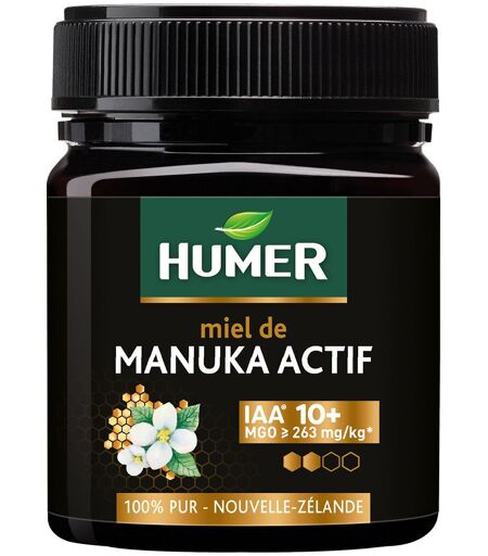 Complément alimentaire à utiliser dans le cadre d’une alimentation variée, équilibrée et d’un mode de vie sain.Humer Miel de Manuka Actif IAA 10+ 250 g est un complément alimentaire à base de miel de Manuka. Sa particularité vient de sa forte teneur en méthylglyoxal (MGO), un composé issu du nectar des fleurs de cette plante australe, le Leptospermum scoparium. Les propriétés bienfaisantes du miel sont décuplées.Ce miel tient ses propriétés exceptionnelles de composés provenant de la plante :le dihydroacétone (DHA) qui se transforme en méthylglyoxal (MGO) durant la maturation du miel. Ce composé naturel est présent dans le miel de Manuka dans des concentrations jusqu'à 100 fois supérieures aux autres miels. C'est sa forte concentration qui favorise l'activité non péroxydique de ce miel.le méthyl-syringate (MSYR) et l'un de ses dérivés, la leptospérine (ou leptosine) issue uniquement du nectar des fleurs de Manuka, qui induisent une action enzymatique convertissant le peroxyde d'hydrogène en hypochlorite de sodium.Plus le taux de MGO d'un miel est élevé, plus ce miel est actif. Ce niveau d'activité est attesté par l'indice IAA®, garantissant que le miel a été testé par un laboratoire et que ses propriétés uniques ont été mesurées scientifiquement.La concentration de Humer Miel de Manuka Actif IAA 10+ en MGO est supérieure ou égale à 263 mg / kg.Ingrédients100% Miel de Manuka (origine Nouvelle-Zélande) IAA® 10+ (MGO ≥ 263 mg / kg*).Cuillère-mesure : 100% bambou.*Niveau minimum de méthylglyoxal garanti en mg/kg.Valeurs nutritionnellesIngrédientPour 2 cuillères-mesuresMiel10 gConseils d'utilisationPrendre 1 cuillère-mesure 2 fois par jour.Précautions d'emploiLa cuillère-mesure est fournie dans la boîte, à laver avant la première utilisation, ne pas la mettre au lave-vaisselle.Ne pas dépasser la dose journalière recommandée. Ne peut remplacer une alimentation variée et équilibrée et un mode de vie sain.Comme tous les miels, ne pas donner aux enfants de moins de 1 an. Tenir hors de portée des jeunes enfants.A conserver dans un endroit frais, à l'abri de la lumière et de l'humidité.Poids net250 gAdresse du Fabricant42, rue de Longvic, 21300 Chenôve, France ...