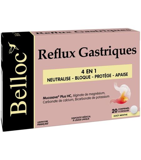 Complément alimentaire à utiliser dans le cadre d’une alimentation variée, équilibrée et d’un mode de vie sain.Belloc Reflux Gastriques est un dispositif médical à usage unique destiné à soulager et apaiser vos reflux gastro-œsophagiens. Sa composition exclusive associe des ingrédients reconnus pour leur efficacité (alginates de magnésium, carbonate de calcium et bicarbonate de potassium) et du Mucosave® plus HC (extrait de feuille de figuier Opuntia et de feuille d’olivier européen).BénéficesA partir de 12 ansSans glutenSans lactoseGoût menthe (format comprimés)Ingrédients Alginate de magnésium 250 mg, Mucosave® Plus HC (Opuntia ficus indica L., Olea Europaea L., maltodextrines) 60 mg, carbonate de calcium 80 mg, bicarbonate de potassium 40 mg. Excipients : Hydroxyde de magnésium, isomalt, sucralose, arôme de menthe, arôme rafraîchissant, arôme masquant, mono et diglycérides d’acides gras, CARBOPOL® 974P NF, cellulose microcristalline, stéarate de magnésium, dioxyde de silicium, carboxyméthylcellulose sodique.Valeurs nutritionnellesIngrédientQuantité pour 1 comprimé (1,3 g)Alginate de magnésium250 mgMucosave® Plus HC (Opuntia ficus indica, Olea europaea, maltodextrines)60 mgCarbonate de calcium80 mgBicarbonate de potassium40 mgExcipientsHydroxyde de magnésium, isomalt, sucralose, arôme de menthe, arôme rafraîchissant, arôme masquant, mono et diglycérides d’acides gras, CARBOPOL® 974P NF, cellulose microcristalline, stéarate de magnésium, dioxyde de silicium, carboxyméthylcellulose sodiqueConseils d'utilisationPrendre 2 comprimés après les repas et 2 le soir avant le coucher. Précautions d'emploiNe pas prendre Belloc Reflux Gastriques en cas d’hypersensibilité connue à ses composants, de perforation et/ou d’obstruction gastro-intestinale. Ne pas administrer ce dispositif médical aux enfants de moins de 12 ans, sauf indication contraire du médecin. Belloc Reflux Gastriques est contre-indiqué en cas de constipation ou de diarrhée chronique, de maladie rénale ou d’insuffisance cardiaque chronique. En cas de prise de médicaments, de grossesse ou d’allaitement, consulter votre médecin avant de prendre le produit. Ne pas dépasser le dosage suggéré, car des quantités plus élevées peuvent provoquer l’apparition d’une constipation ou d’une diarrhée passagère. Le produit ne présente aucune contre-indication à être associé aux produits pharmacologiques tels que l’oméprazole, la cimétidine ou le cisapride ; toutefois, il est recommandé de demander l’avis d’un médecin avant de commencer à prendre Belloc Reflux Gastriques.Poids net20 comprimésAdresse du FabricantLABORATOIRES URGO HEALTHCARE42, rue de Longvic21300 ChenôveFrance ...