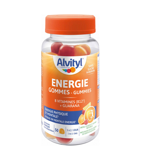 Alvityl® Energie Gommes apporte un complexe optimal de Guarana et de vitamines, dont la vitamine B12 pour : contribuer à un métabolisme énergétique normalcontribuer à des fonctions psychologiques normalesaider à réduire la fatigueProfitez du bon gout d’Alvityl® Energie Gommes avec ses 3 arômes naturels : Orange, Citron et Framboise. À base de pectine de fruit d’origine naturelle et sans sucre, ces gummies sont adaptées aux personnes diabétiques. Aromes, colorant et gélifiant naturels.Sans gélatine, sans sucre. ...